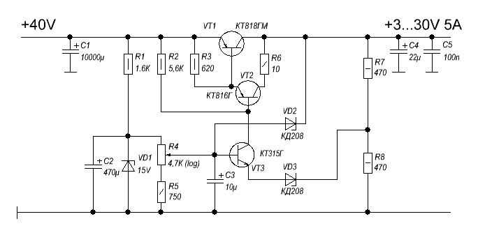 регулируемый блок лабораторный блок питания своими руками 0 30в 0 10а простая схема регулятор напряжения на двух транзисторах.