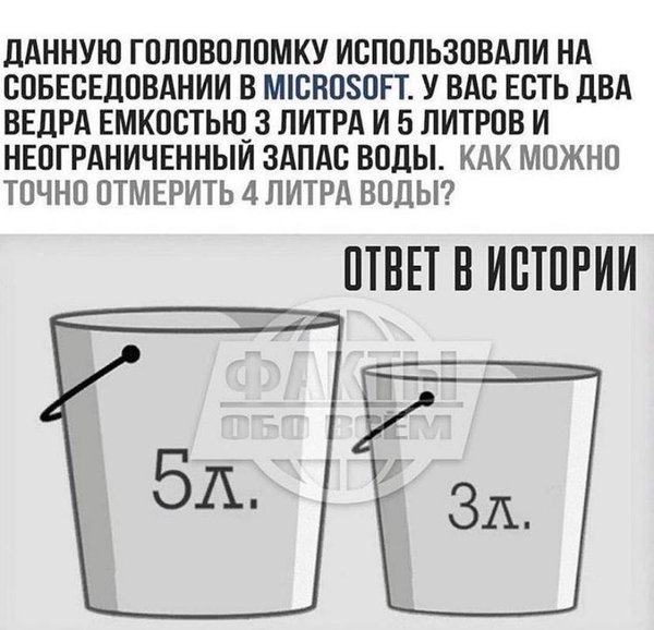 у вас есть два ведра емкостью 3 литра и 5 литров и неограниченный запас воды. выливаем 3 л в другое ведро затем выливаем из него эти 3 литра. как можно отмерить точно 4 литра воды. затем вылить эти 3 литра и оставшиеся 2 литра из первого ведра перелить в 3 х литровое ведро.